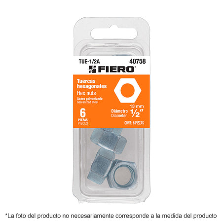 Blíster con 25 tuercas 1/4' hex de acero galvanizado, Fiero