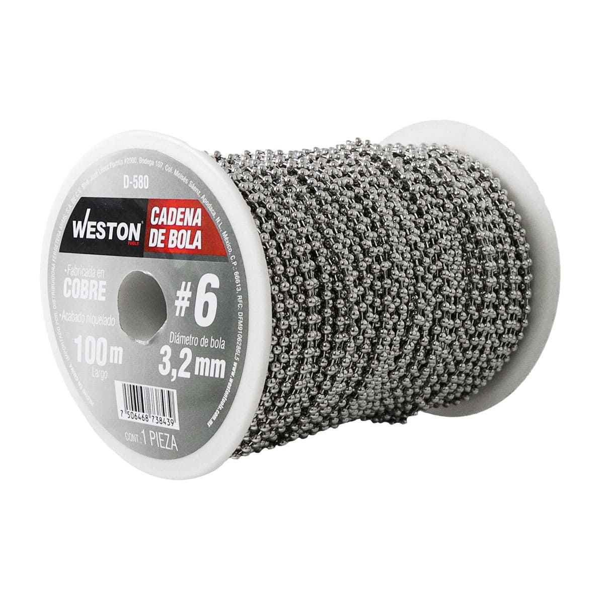 CADENA DE BOLA COBRE NIQUELADA #6 3.2MM ROLLO 100M, WESTON