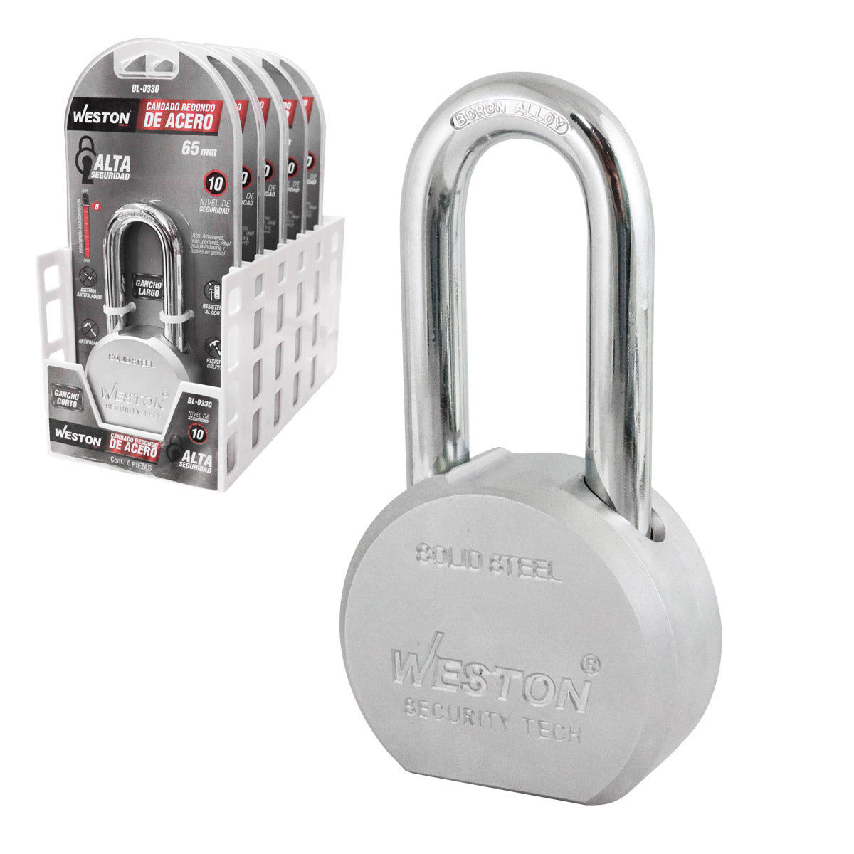 CANDADO REDONDO ACERO GANCHO BORO ALTA SEG. 65MM G. LARGO C/3 LLAVES (EMP. C/6 PZAS - PRECIO X PZA), WESTON