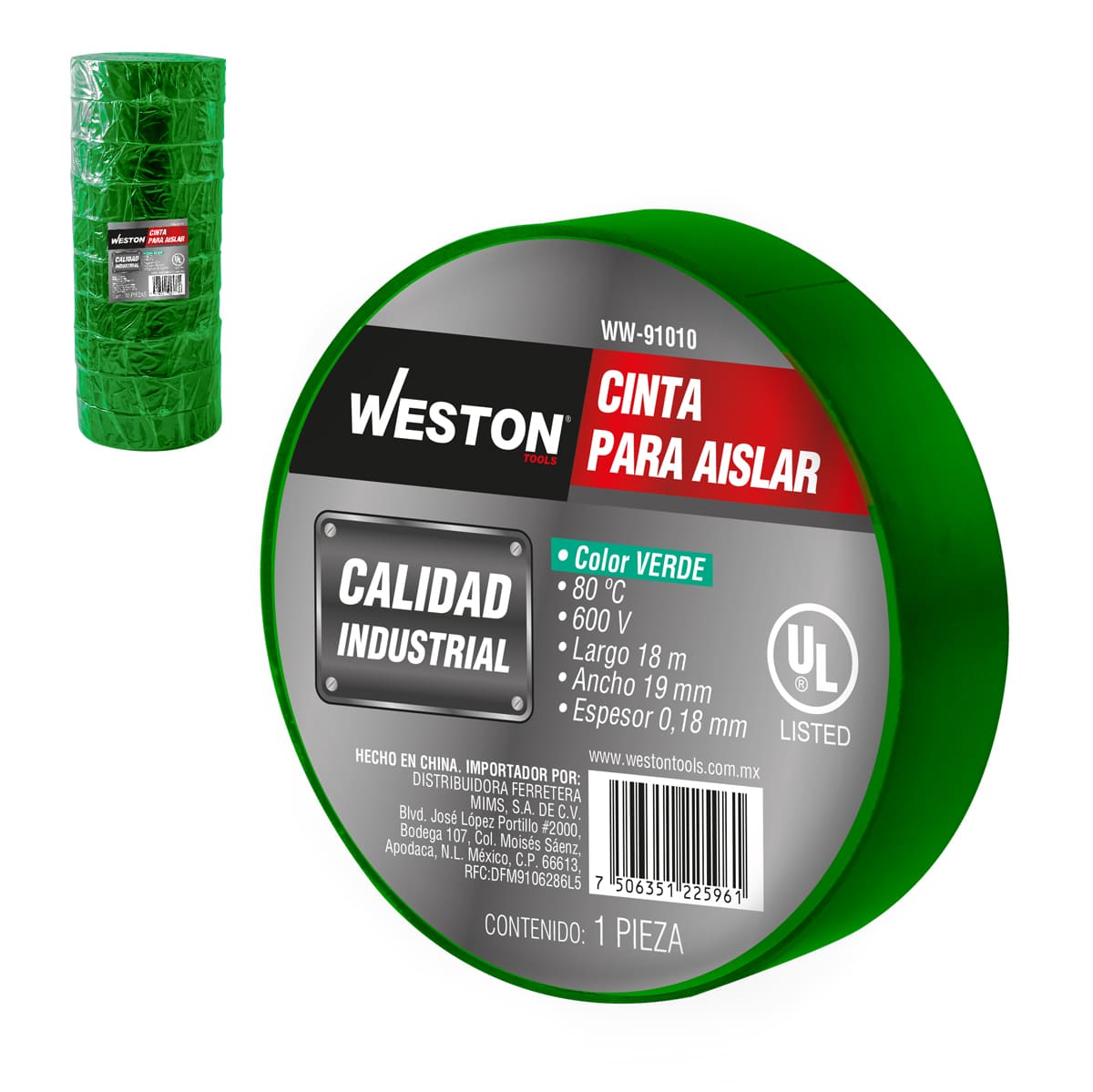 CINTA PARA AISLAR 18 m X 19 mm COLOR VERDE (10 PIEZAS), WESTON