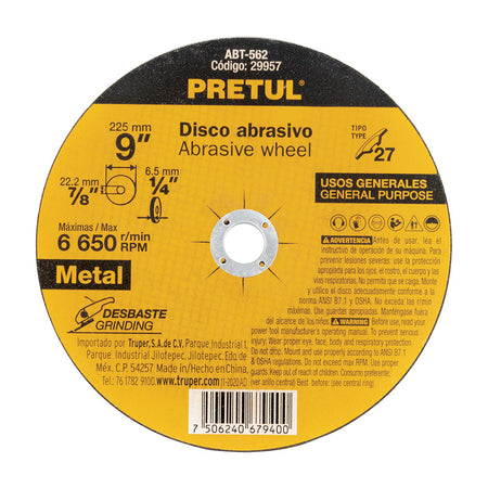 Disco Tipo 27 de 9' x 6.2 mm desbaste de metal, Pretul