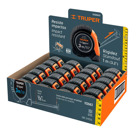Flexómetro Gripper 3 m cinta 13 mm display box con 24 piezas