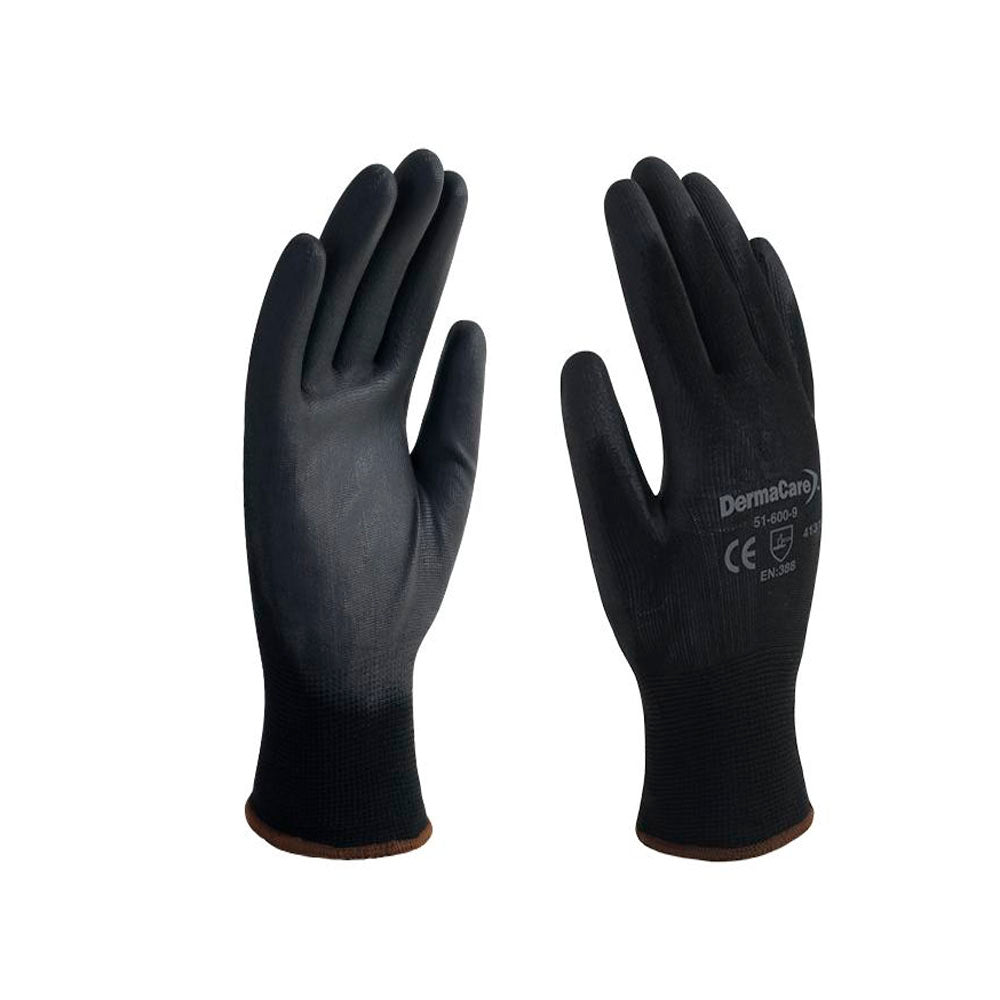 GUANTE POLIESTER NEGRO PALMA POLIURETANO TALLA GRANDE, (TALLA 9, PRECIO X PAR) DERMACARE