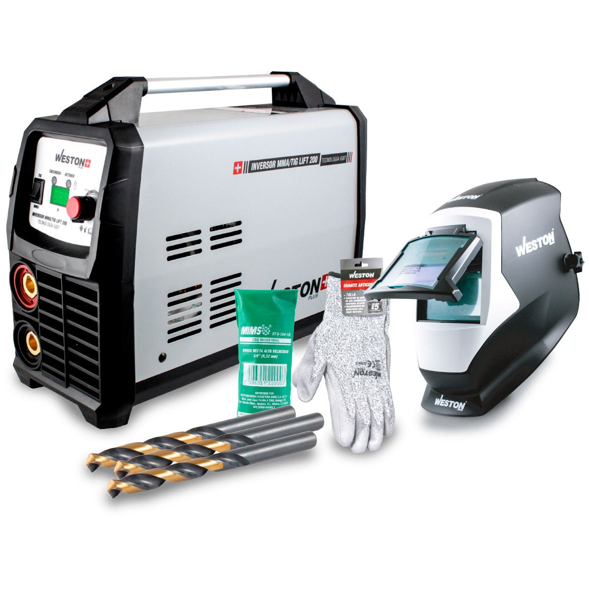 INVERSOR MMA 200AMP 110/220V 1 FASE IGBT PLUS C/LIFT TIG, CARETA P/SOLDAR ELECT. CON VENTANA ABATIBLE, 10 BROCA A.V. 1/4'' MIMS, GUANTE ANTICORTE NIVEL 5 TALLA 9 WESTON
