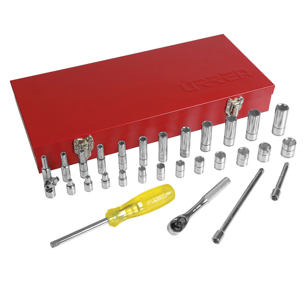 Juego de dados y accesorios cuadro de 1/4" métrico, 30 piezas, URREA