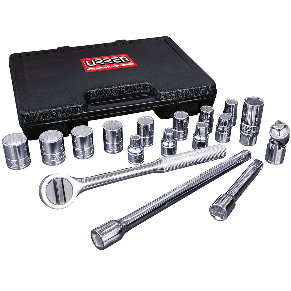 Juego de dados y accesorios cuadro de 1/2" métrico, 17 piezas, URREA
