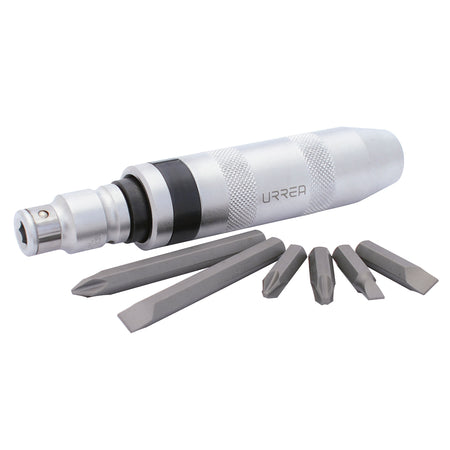 Juego de destornillador de golpe con puntas intercambiables, 8 piezas en caja plástica, URREA