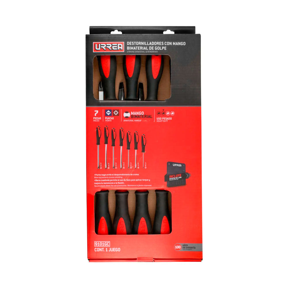 Juego de destornilladores con mango bimaterial de golpe, combinados, 7 piezas en estuche Urrea 9101GC