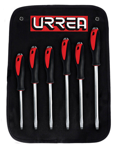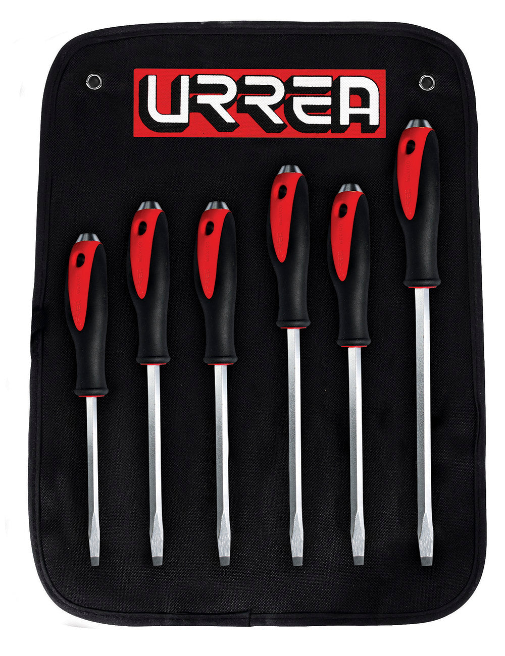 Juego de destornilladores con mango bimaterial de golpe, punta plana, 6 piezas en estuche, URREA