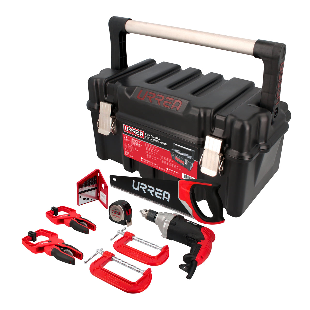 Juego de herramientas con taladro 21 piezas, caja plástica URREA
