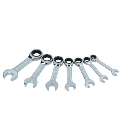 Juego de llaves combinadas cortas pulido espejo de matraca en pulg, 12 puntas,7 pz en rack, SURTEK