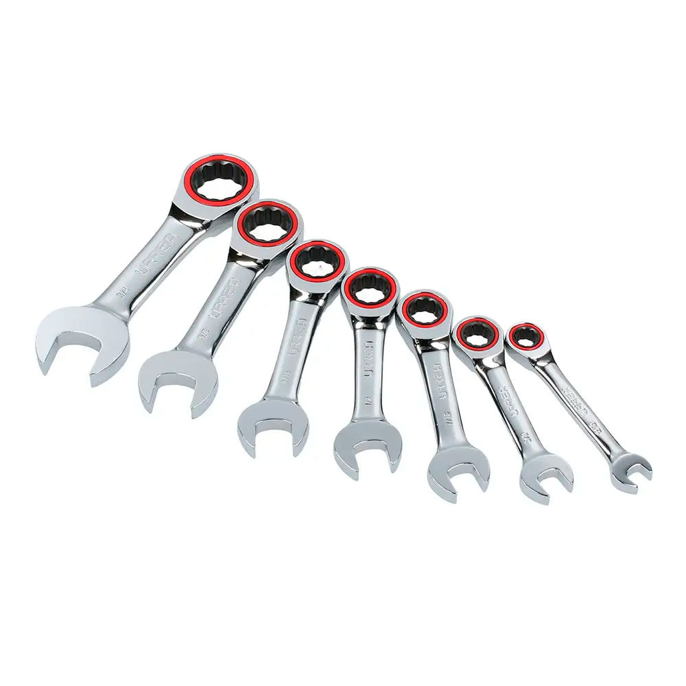 Juego de llaves combinadas ctas pulido espejo de matraca en pulg, 12 puntas,7 pz en rack, URREA