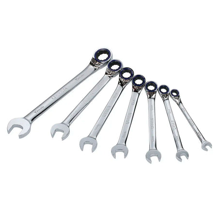 Juego de llaves combinadas pulido espejo de matraca rev mét, 12 puntas,7 pz en rack Urrea 12MR7M