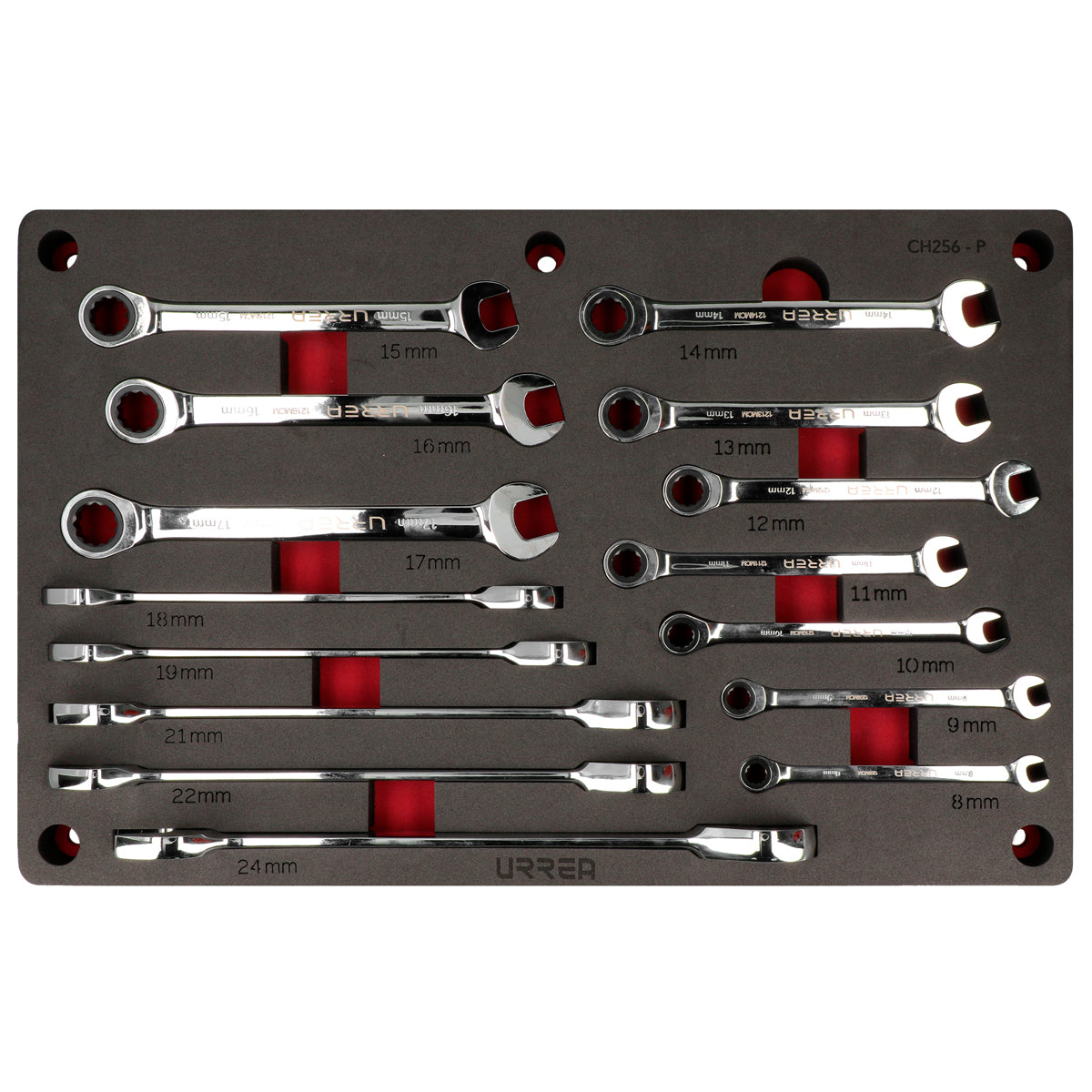 Juego de llaves combinadas pulido espejo de matraca métricas 15 piezas, CH256P-C Urrea CH256P