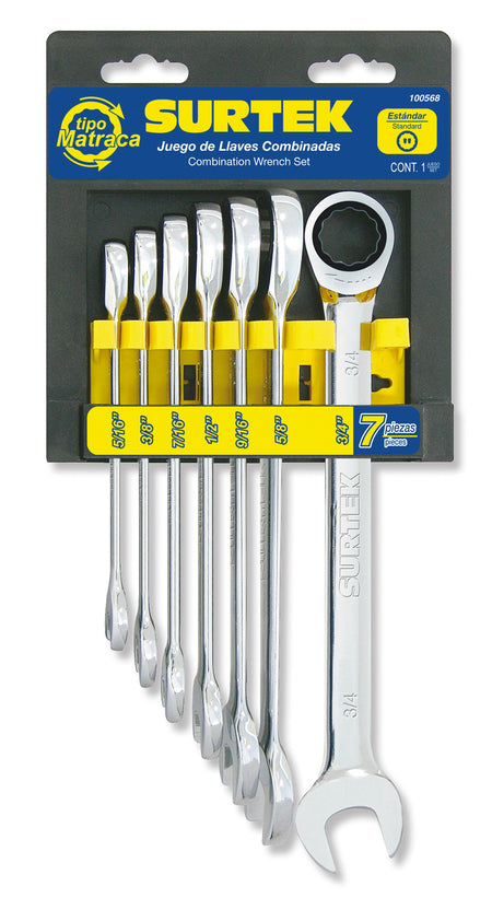 Juego de llaves combinadas pulido espejo de matraca en pulg, 12 puntas, 7 piezas en rack Surtek 100568