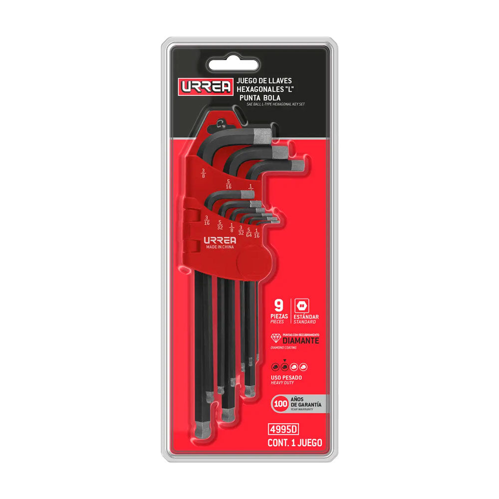 Juego de llaves hexagonales tipo "L" punta de bola diamante, combinadas, 9 piezas Urrea 4995D
